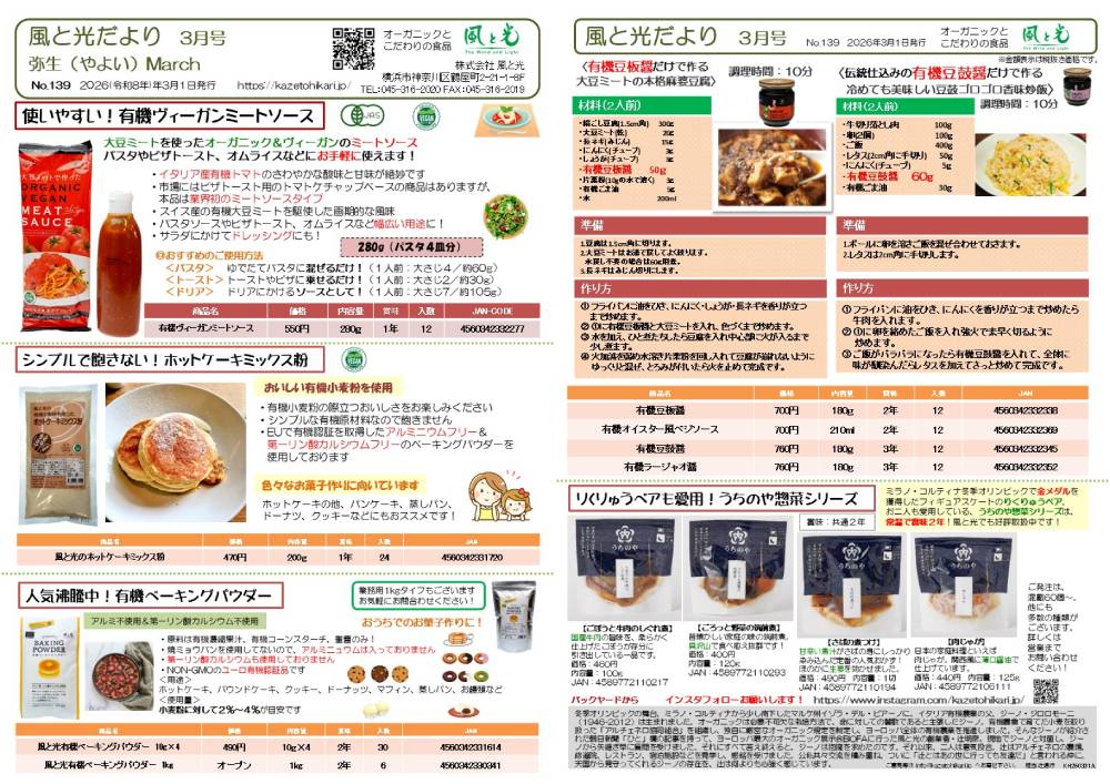 風と光だより2026.03.03月刊「風と光だより」2026年3月号 特集有機ヴィーガンミートソース、ホットケーキミックス粉、有機ベーキングパウダー、有機台湾中華調味料りくりゅう愛用の惣菜シリーズ ⬆︎Download